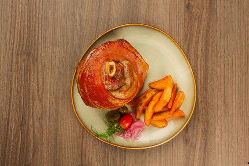 3. 撒料:烤好的肘子取出,撒上适量的椒盐、孜然粉等调料,增加口感层次。